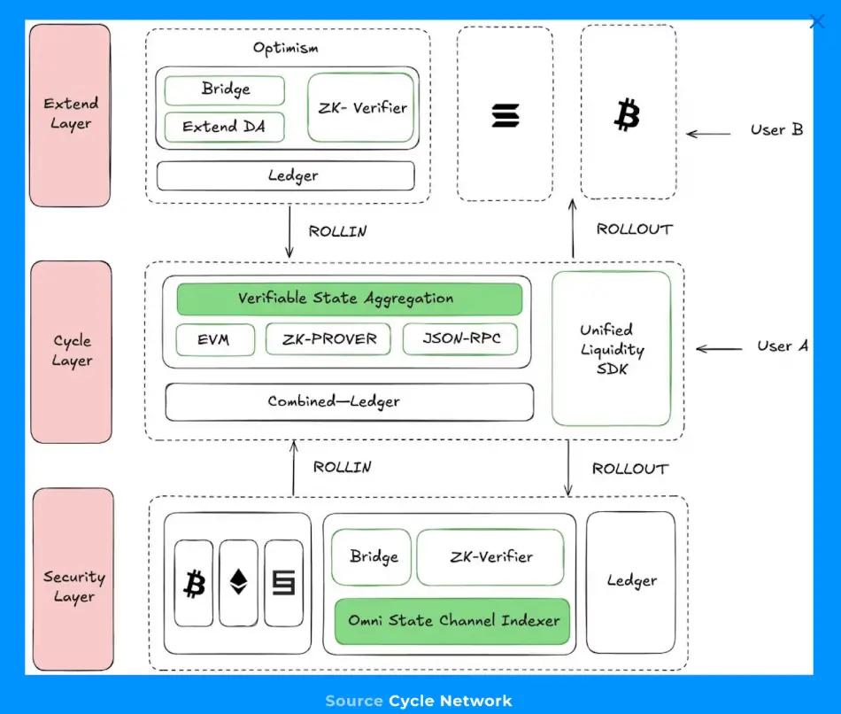 Cycle Network的技术架构旨在通过三大核心组件——安全层、扩展层和Cycle层,将多链网络整合为统一的无桥结算层。