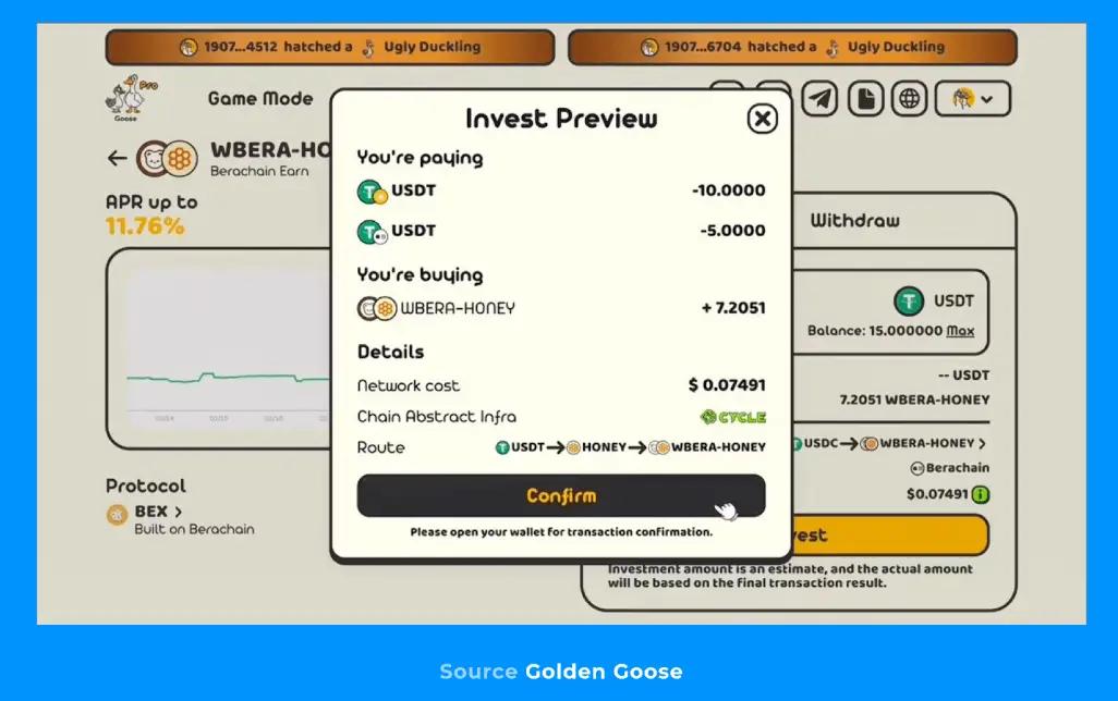 Golden Goose是基于Cycle Network构建的GameFi平台,将多链策略简化为游戏化体验。用户质押USDT等资产即可"孵化"虚拟鹅,通过完成收益任务获取VEGOOSE代币奖励及CYC代币空投。该平台底层由Cycle实现自动跨链、兑换、Gas支付、流动性提供及质押功能,用户仅需通过统一仪表盘选择策略并点击"质押",系统即通过Rollin/Rollout基础设施和统一流动性系统实现资产多链调度。