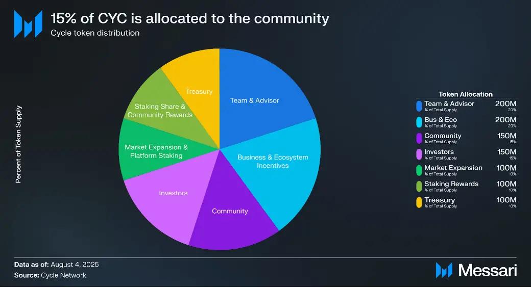 Cycle Network的代币经济模型采用固定供应量的CYC代币作为网络效用代币和治理代币,总供应量为10亿枚且永不增发。CYC分配涵盖多个类别,旨在同步推动项目发展与社区激励:
