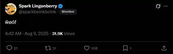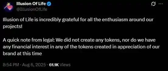 也就是这天,$SPARK 代币在 pump.fun 上发射。Bags 上的同名 ticker 也一度超过百万美元市值,但最后 pump.fun 上的跑了出来。在跑出来之前,8 月 6 日,还出现了一个插曲,Illusion of Life 官推宣布,他们没有创建任何代币,也和任何代币没有利益关系,这导致 $SPARK 从第一个接近 2000 万美元市值的高点一度跌至 200 万美元市值以下。