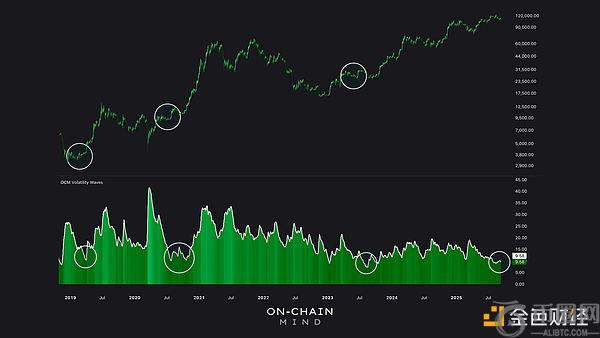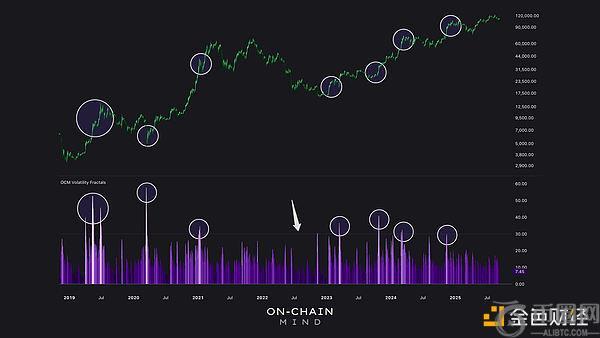 即使在波动率较低的时期,剧烈波动仍然可能发生。比特币的历史模式显示,平静的盘整期往往预示着爆发性走势。这些时刻本身并不具有风险,而是市场潜在能量的积聚,等待释放。