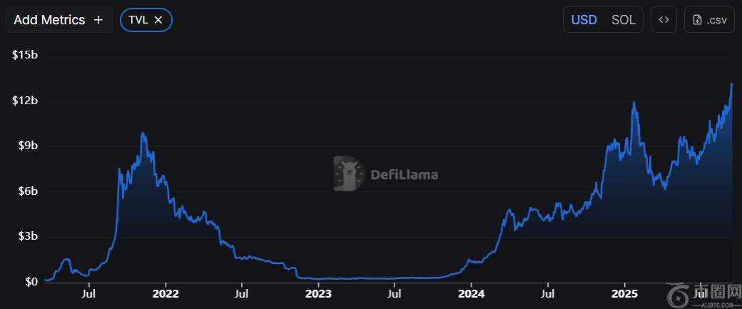 加密情报追踪公司 DefiLlama 的数据显示,Solana 的总锁定价值 (TVL) 增幅在周日达到了 132.2 亿美元的历史新高 (ATH)。TVL 的增长表明 Solana 生态系统内的活动和兴趣日益增长,这表明越来越多的用户正在基于 SOL 的协议中存入或使用资产。