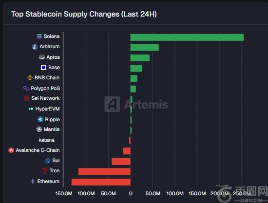 稳定币总供应量变化(过去 24 小时)图表。资料:Artemis 终端
