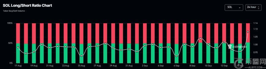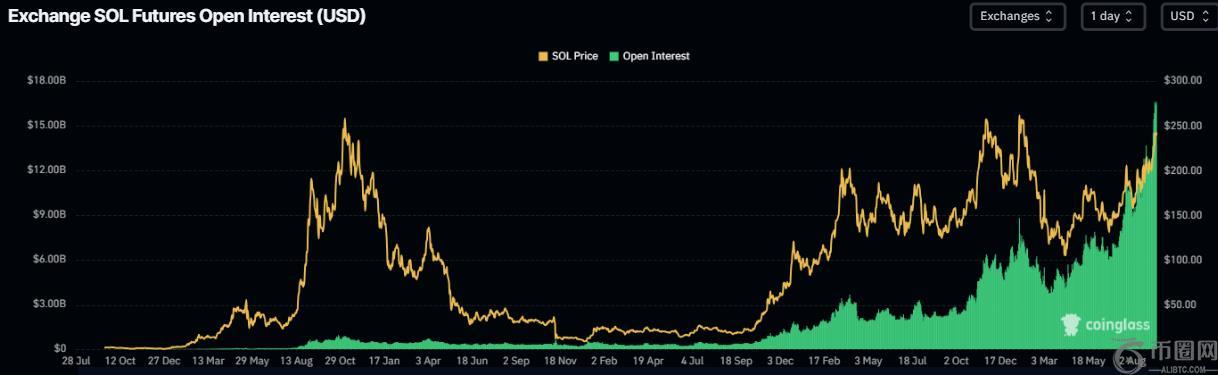在衍生品方面,Solana 持续走强。CoinGlass 的数据显示,周一各交易所 Solana 期货的未平仓合约 (OI) 创下 165.8 亿美元的历史新高。未平仓合约的增加表明有新的或额外的资金进入市场,并有新的买盘,这可能会推动当前 Solana 的价格上涨。