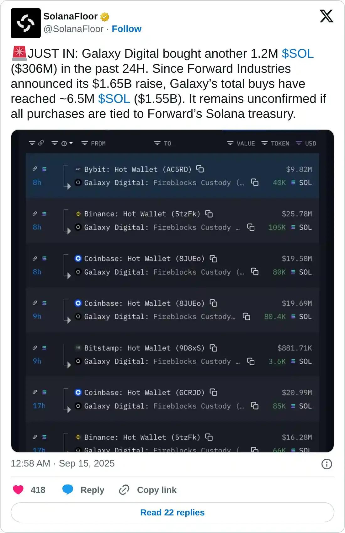 此外,SolanaFloor 数据显示,Galaxy Digital 在过去 24 小时内额外购买了 120 万枚 SOL 代币,价值 3.06 亿美元。自 Forward Industries 周四宣布融资 16.5 亿美元以来,Galaxy 的总购买量已达到近 650 万枚 SOL,价值 15.5 亿美元。目前尚不清楚所有购买是否都与 Forward 的 Solana 资金池相关。