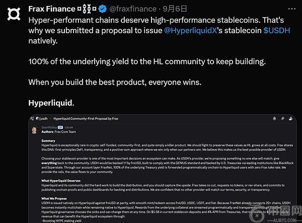在最新的USDH竞标赛中,Frax提出「社区优先」提案,并计划将USDH与frxUSD 1:1挂钩,底层国债收益将通过链上程序化方式直接分配给Hyperliquid用户。