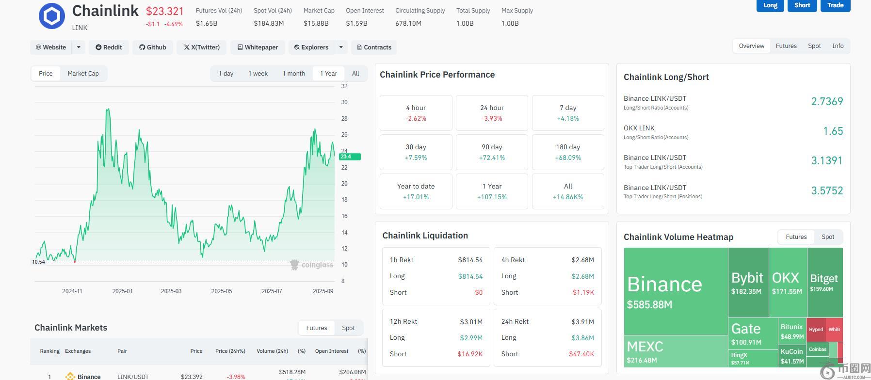 Coinglass 平台上的 LINK 交易正在升温。币安交易量增长了 18%,MEXC 交易量增长了近 10%。尽管 LINK 看涨,但去中心化永续交易所 Hyperliquid 的交易量却下降了 23%。总体而言,市场信心高涨,各账户以及顶级交易员(尤其是在币安)的多空比为 3,这表明大多数交易员预计 LINK 价格将突破 30 美元。