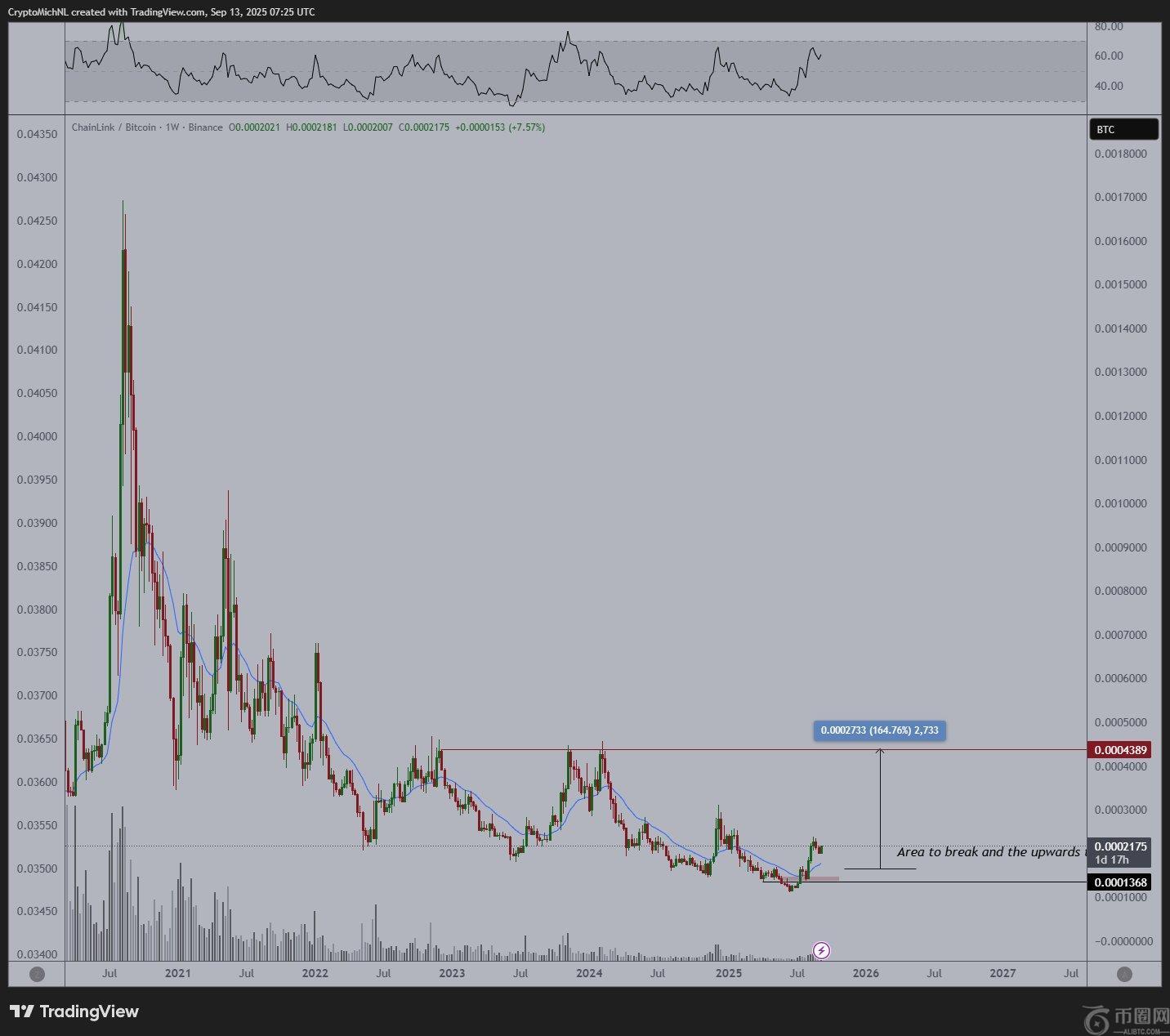 这种乐观情绪体现在多个 Chainlink 价格预测中。在 X 平台上,一位分析师指出 LINK/BTC 已准备好上涨。