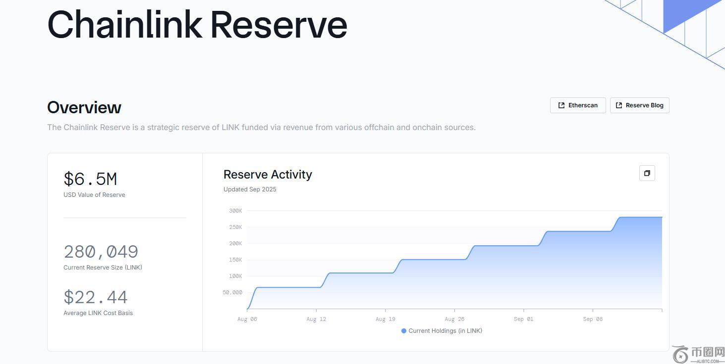 截至 9 月 15 日,超过 280,000 个 LINK 已添加到 Chainlink 储备中,价值 650 万美元。