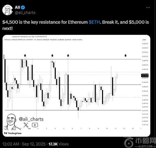 以太坊价格正处于下一阶段上涨的关键关口。过去 24 小时内,该币种上涨约 3%,截至发稿时,交易价格接近 4,550 美元阻力位。
