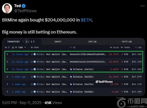 区块链数据显示比特矿购买了价值约 2.04 亿美元的 ETH,使其总持有量增至约 92 亿美元。