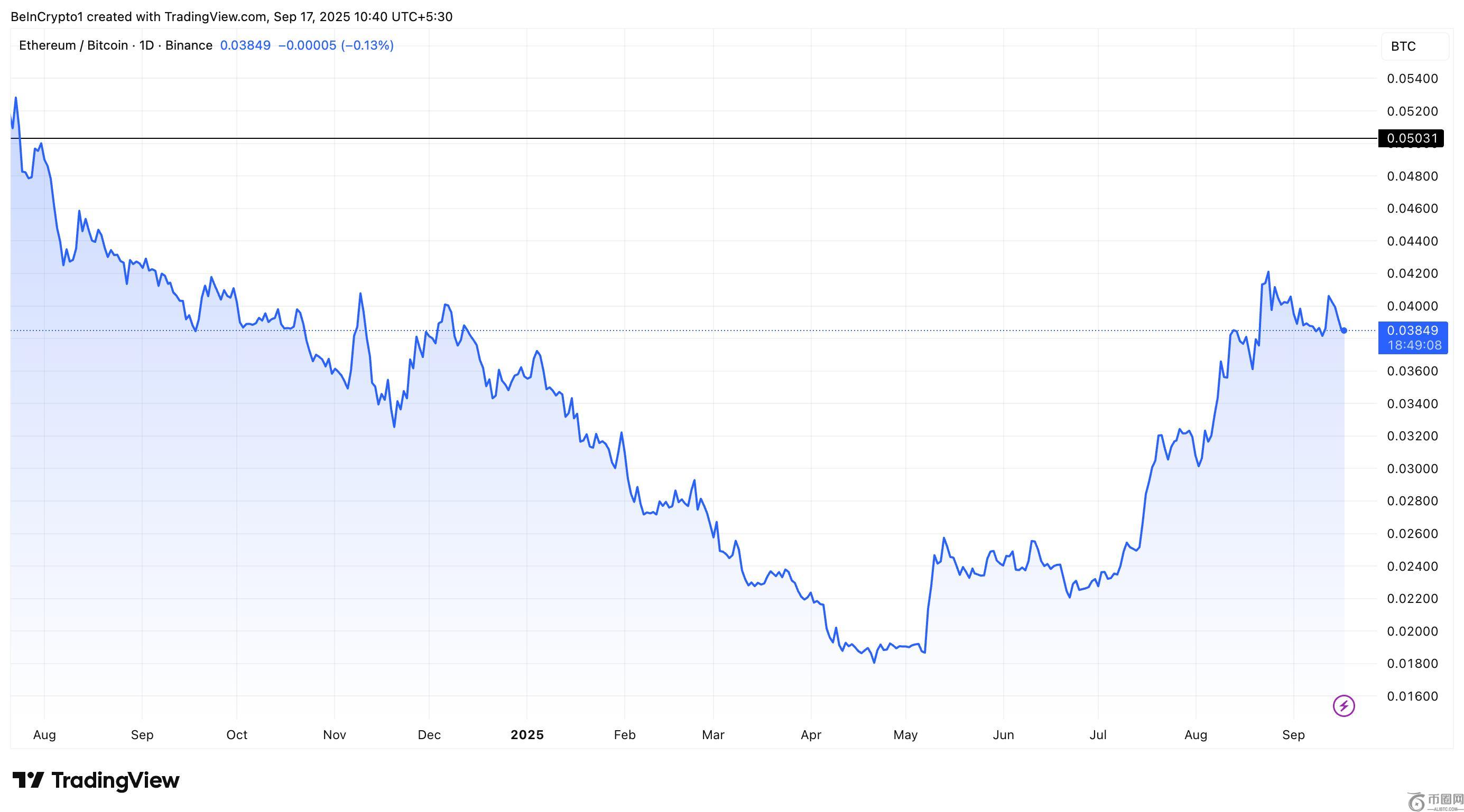 ETH/BTC 比率是衡量以太坊 (ETH) 相对于比特币 (BTC) 实力的关键指标,该比率一年多来一直保持在 0.05 以下,凸显出即使在许多分析师称之为“以太坊季节”的时期,以太坊仍难以与最大的加密货币抗衡。