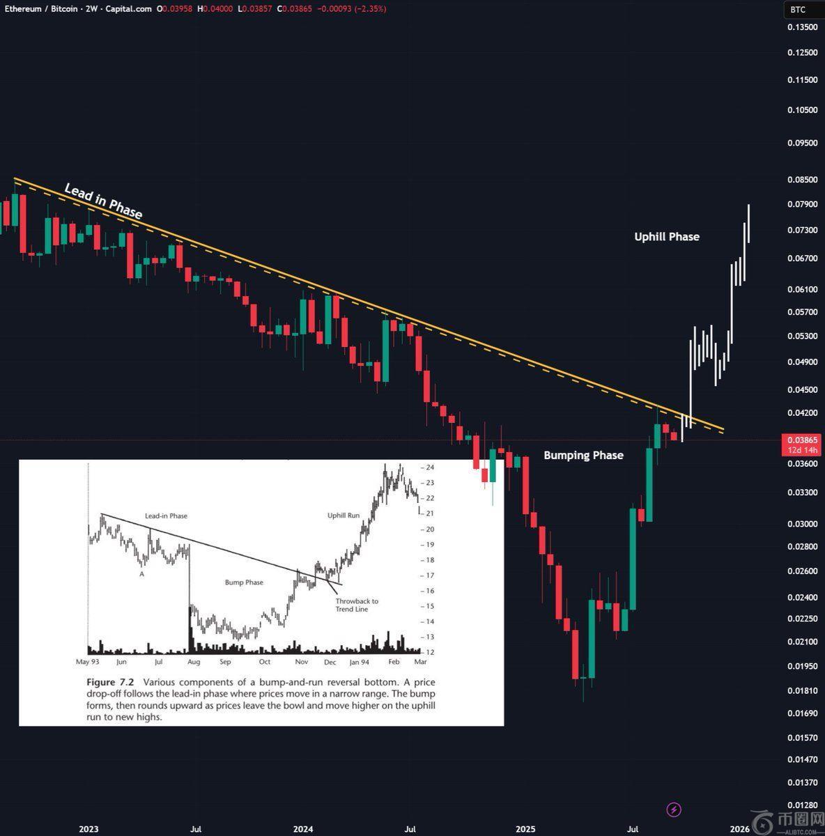 另一位分析师将其与 2021 年周期进行了类比,当时 ETH/BTC 的形态类似预示着季节的到来.