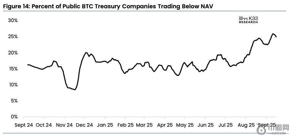 据 K33 报道,比特币资金管理热潮正在减弱,目前四分之一的公共 BTC 资金管理公司的市值低于其持有的比特币的价值。