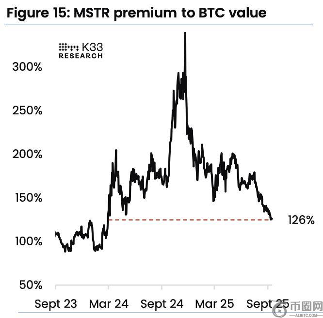 MSTR 相对于 BTC 的价值溢价。图片:K33.