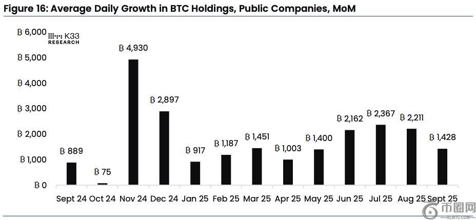 BTC 持有量日均增长情况(上市公司持仓)环比增长。图片:K33.