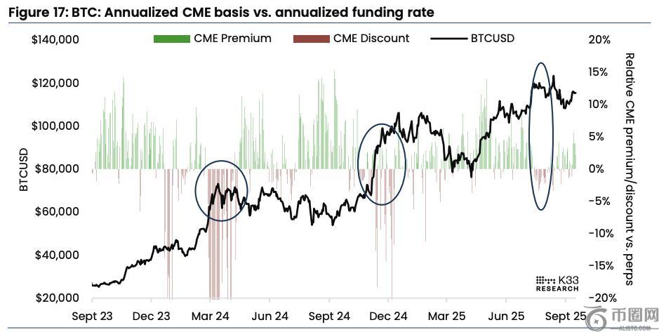 CME 年化基差 vs. 年化融资利率。图片:K33.
