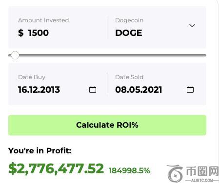 根据 Changelly 的投资回报率 (ROI) 计算器,假设您在 2013 年 12 月 16 日投资了 1500 美元购买狗狗币 (DOGE),这笔投资如今的价值将超过 110 万美元。您的资金将增长约 74,081%。