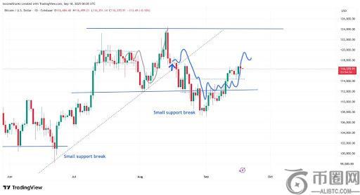 他在 X 社交媒体上分享的分析得到了一张图表的支持,该图表显示近期下跌并可能延续上涨趋势。目前,比特币已从 108,000 美元下方的回调中反弹,并且目前交易价格超过 117,000 美元IncomeSharks 的图表突显出一个“小幅支撑位突破”已被收复,这增强了价格进一步上涨的看涨理由。如果势头如预期持续,那么对 124,000 美元附近阻力位的决定性考验似乎即将到来。