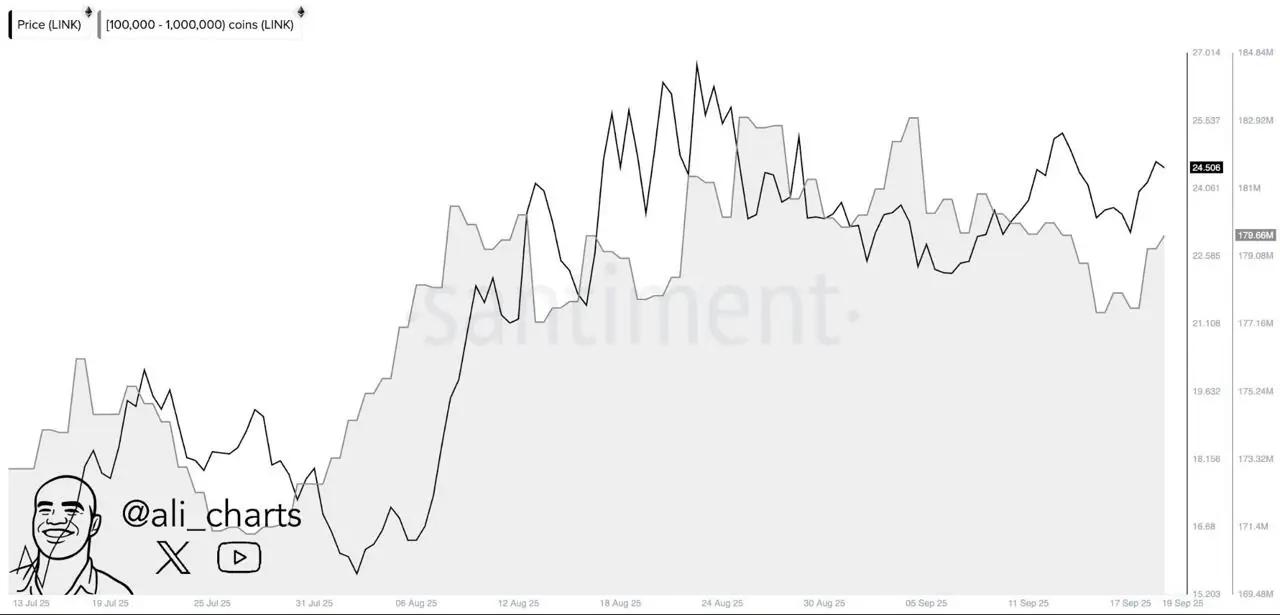 Chainlink 近期走势横盘整理,略有看涨。价格正在形成一个对称三角形,阻力位在 24.50-25 美元附近。如果 LINK 突破该区域,许多人认为其短期内可能测试 28-32 美元。