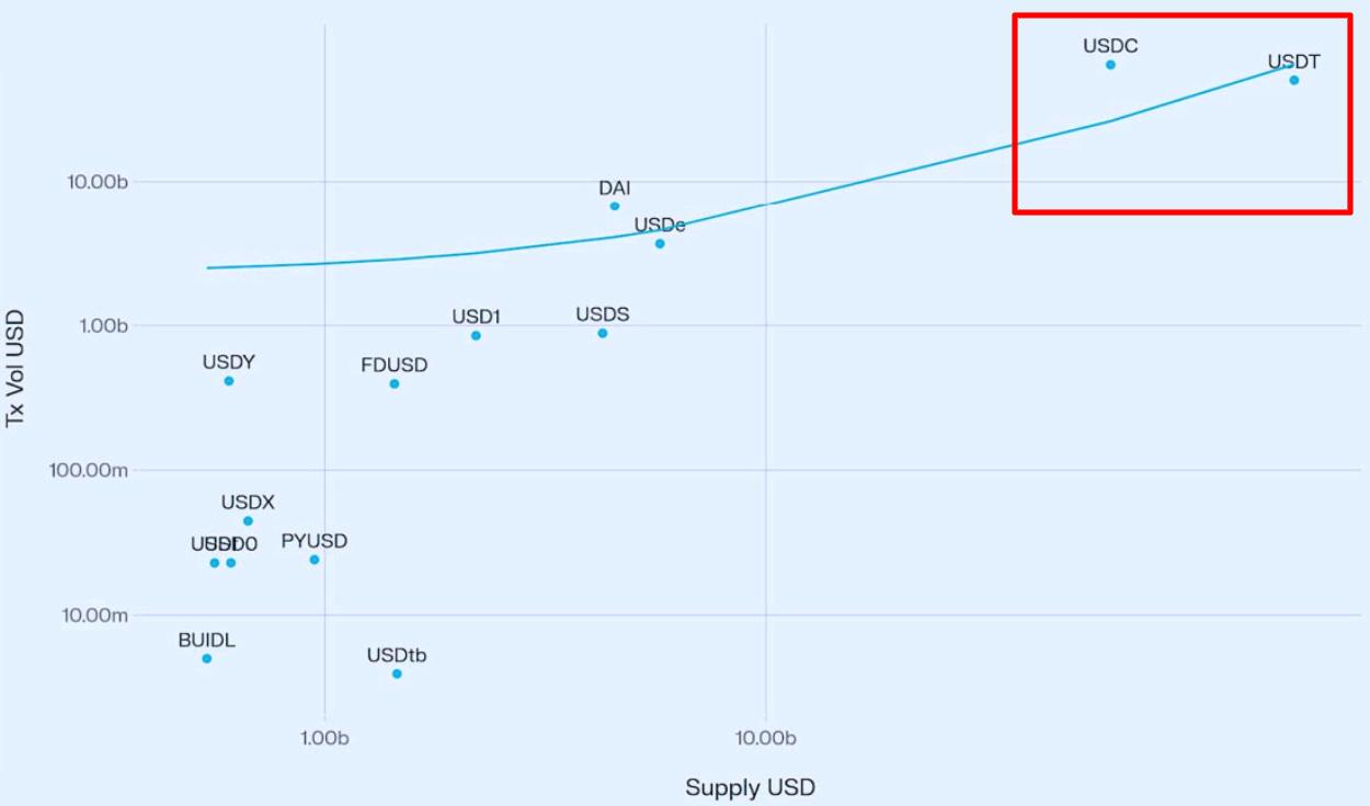 研究支持这一方向。根据 Vedang Ratan Vatsa 的研究,稳定币供应量与交易量之间存在很强的正相关性,这意味着更大的供应量意味着更深的流动性和更高的采用率。Tether 和 Circle 作为两大发行方,因此它们已准备好捕捉这种机构流动性。