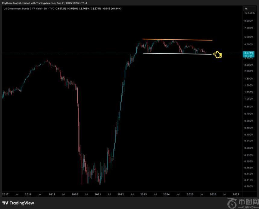 但目前,它们正处于关键支撑位,两年期国债收益率已引发下行趋势,只是尚未创下新低。如果收益率进一步下跌,可能会引发全球市场的波动。