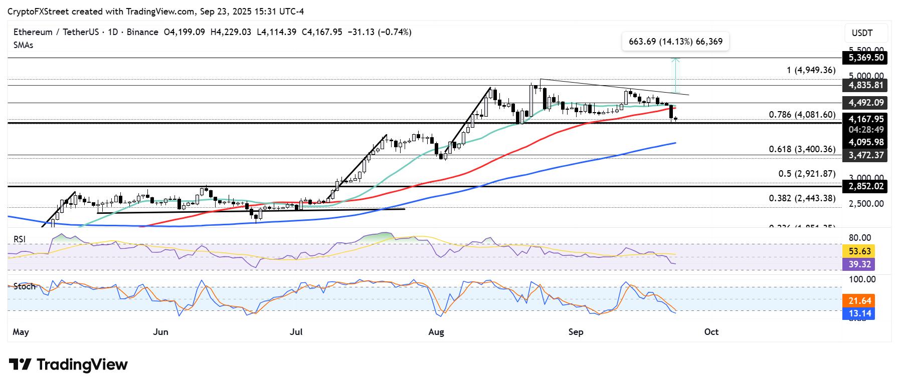 ETH 周二重新测试了 4,100 美元附近的支撑位。空头继续控制短期趋势,ETH 交易价格低于 50 日简单移动平均线 (SMA)。