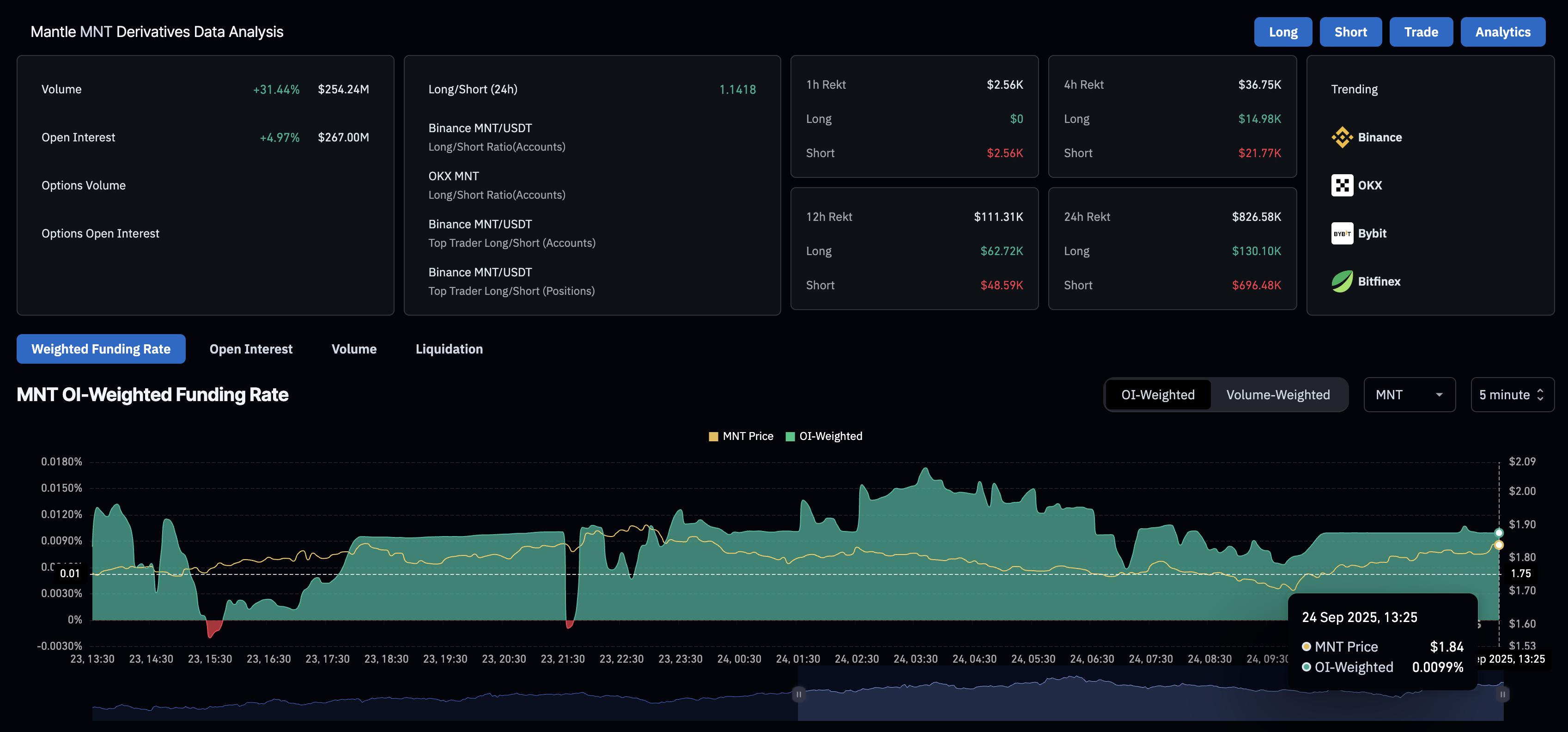 CoinGlass数据显示,在新的整合之后,MNT未平仓合约(OI)在过去24小时内增加了4.97%,目前达到2.67亿美元。MNT衍生品锁定资金的大幅增加,表明交易员的风险偏好情绪高涨。