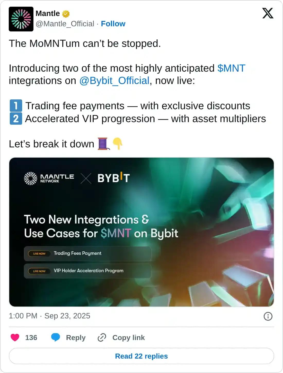 Mantle 周二宣布与 Bybit 交易所达成两项新的合作,MNT 持有者将享受现货交易 25% 的折扣和衍生品交易 10% 的折扣。此外,MNT 代币的价值将达到 1.5 倍,使 Bybit 用户能够获得 VIP 身份,享受诸如降低手续费、提高存取款限额等福利。