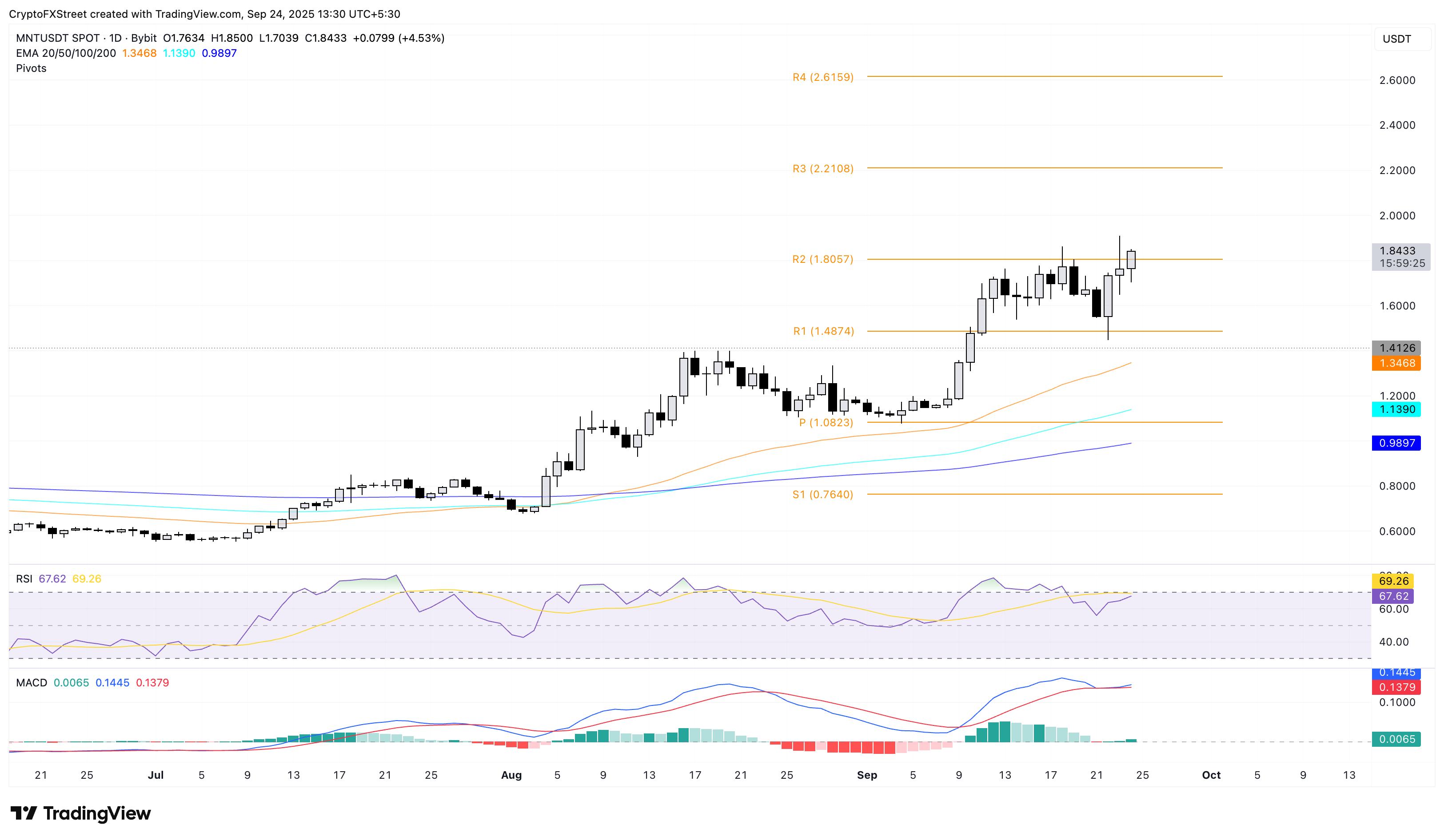 Mantle (MNT) 价格连续第三天上涨,截至周三发稿时交易价突破 1.80 美元。周二,MNT 宣布推出 VIP 持有者计划,并降低交易费,提振了市场对 MNT 衍生品的兴趣。此外,技术前景预示着 MNT 价格将持续上涨,并可能创下历史新高。