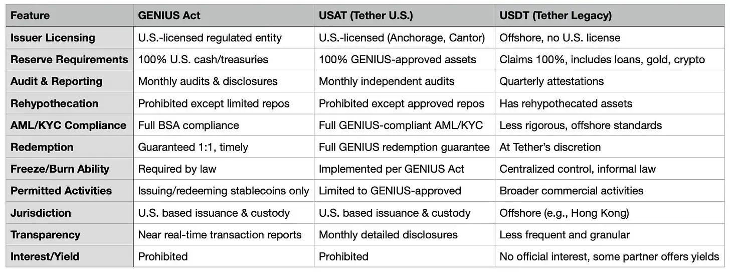 但背后还有一个更深层次的战略原因:市场细分。通过创建 USAT,泰达可以为美国机构提供一种「高端」受监管产品,同时保持 USDT 作为面向其他市场的「全球标准」。这就像同时拥有一个奢侈品牌和一个大众市场品牌——同一家公司,为不同客户提供不同产品。