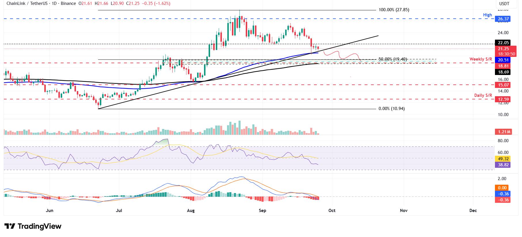 如果 LINK 跌破上升趋势线,则跌势可能延续至 50% 价格回撤位 19.40 美元。