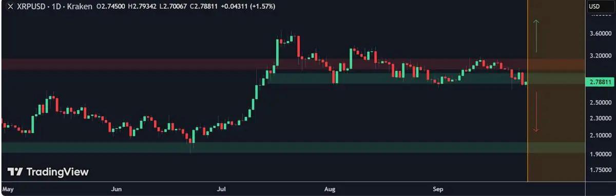 XRP 今日交易价位在 2.80 美元至 3.10 美元之间。若能有效突破 3.10 美元并守住,且成交量强劲,则有望进一步上探 3.30 美元至 3.50 美元。若未能突破该区间,则 2.60 美元至 2.75 美元仍需守住。