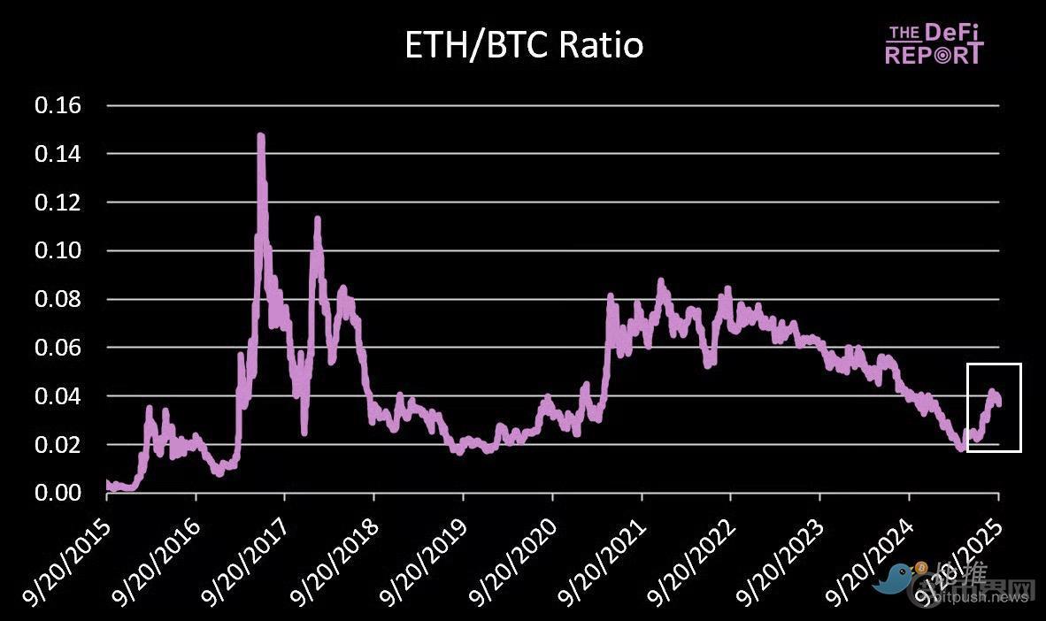 ETH 最先上涨,ETH/BTC 比率从 4 月份的低点 0.018 上涨到 0.042,因为流动性从 BTC 转移。