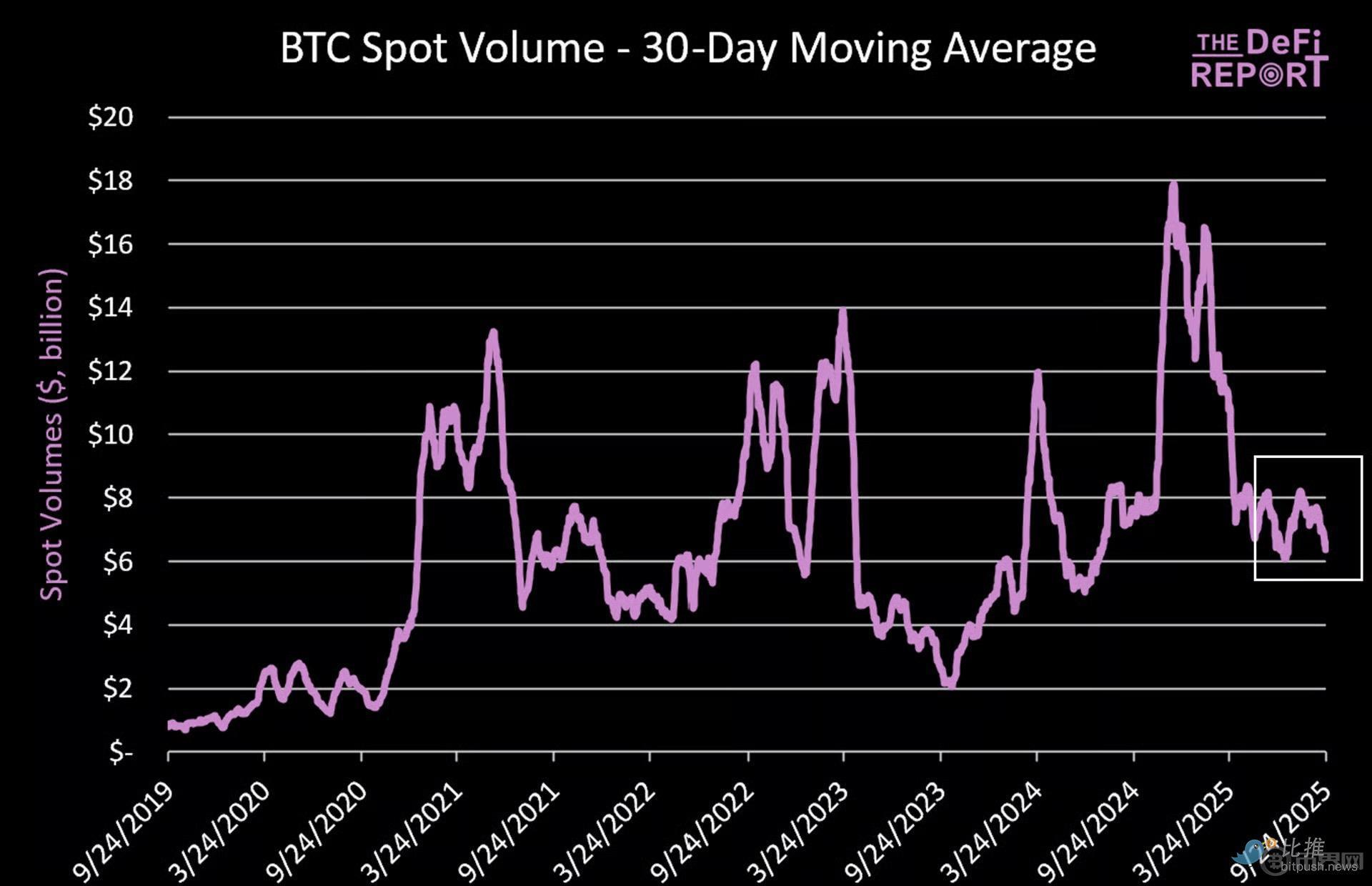 交易量在今年早些时候达到峰值后仍然低迷——这表明在过去六个月中,缺乏大量“新资金”进入市场。