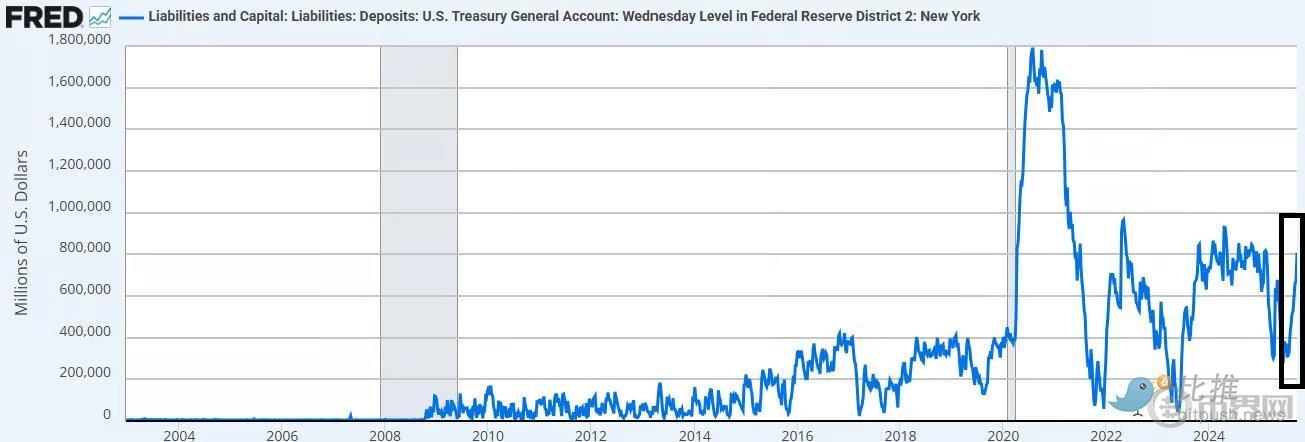 话虽如此,我们确实看到一些流动性因美国财政部补充其“活期账户”而被撤出市场。在过去几周,大约 5000 亿美元被重新添加到 TGA(美国财政部一般账户)中。
