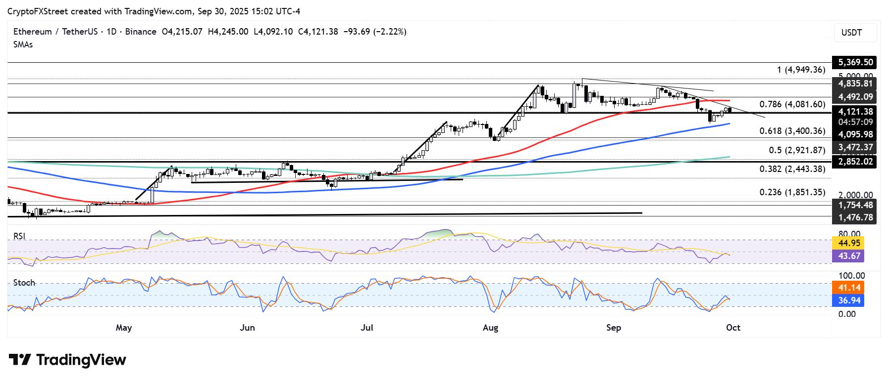 ETH 在周末反弹后,跌破了自 9 月 13 日延续的下行趋势线阻力位。跌破该阻力位后,这枚顶级正在测试 4,100 美元,而空头在 2024 年曾多次在此水平发起抛售压力。