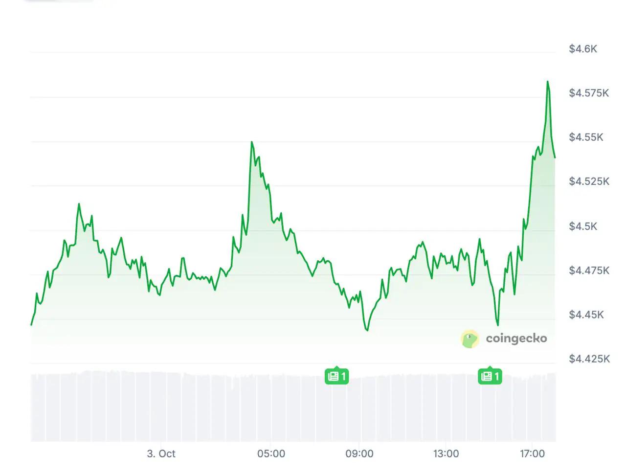 SWIFT 的Linea 的整合为技术布局增添了根本性的催化剂,因为持续的需求往往伴随着银行将存款代币化并在以太坊基础设施上进行结算。分析师预测,持续的涨势可能会持续到4,800-5,000美元如果突破 4,500 美元的阻力位,则到 10 月收盘时价格将上涨。