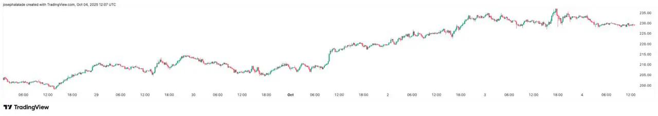 Solana (SOL) 继续保持看涨势头,目前交易价格接近 229.64 美元,投资者正在权衡下一步走势。分析师预计,短期内 SOL 将在 195 美元至 225 美元之间波动,如果 210 美元左右的关键支撑位保持不变,则可能上涨至 240 美元至 245 美元。