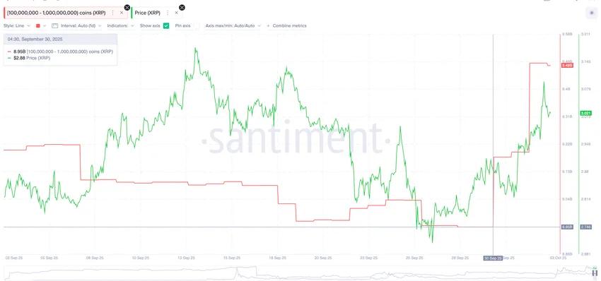 尽管市场普遍持悲观态度,但巨鲸仍在悄悄地大量囤积 XRP,反映出人们对该币种的兴趣日益浓厚。Santiment 数据显示,过去一周,持有 1000 万至 1 亿 XRP 的地址增持了近 1.2 亿枚 XRP(价值 3.4 亿美元),使其控制的 XRP 总量达到 8%。