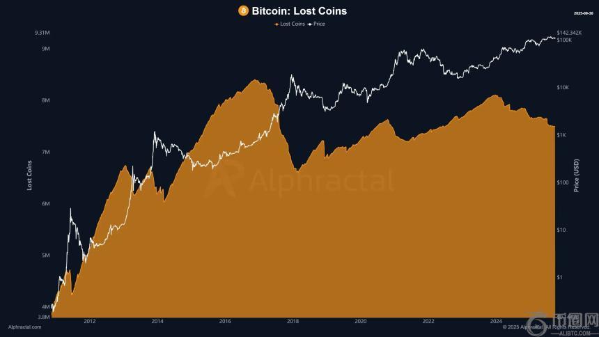 分析师经常低估“丢失币”在塑造供应动态方面的作用。当该指标上升时,通常表明早期钱包的抛售不足,这往往会转化为价格的横盘走势,甚至出现熊市