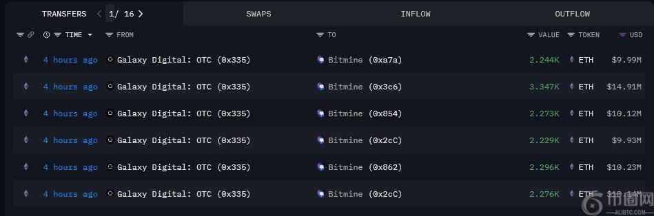据区块链分析平台Arkham Intelligence数据显示,BitMine通过Galaxy Digital的场外交易 台 完 成六笔交易以完成此次收购。