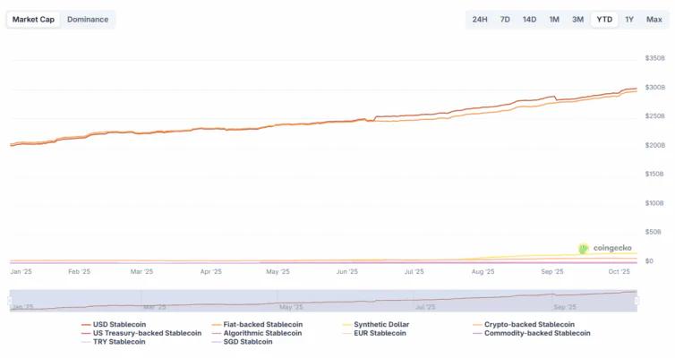 看看美元支持的稳定币的崛起就知道了。单就它们而言,它们就拥有市值3009亿美元,今年迄今已上涨 45.6%,与唐纳德·特朗普 (Donald Trump) 的总统任期同时发生(自称“加密货币总统”(支持对加密货币更加友好的美国法规)。